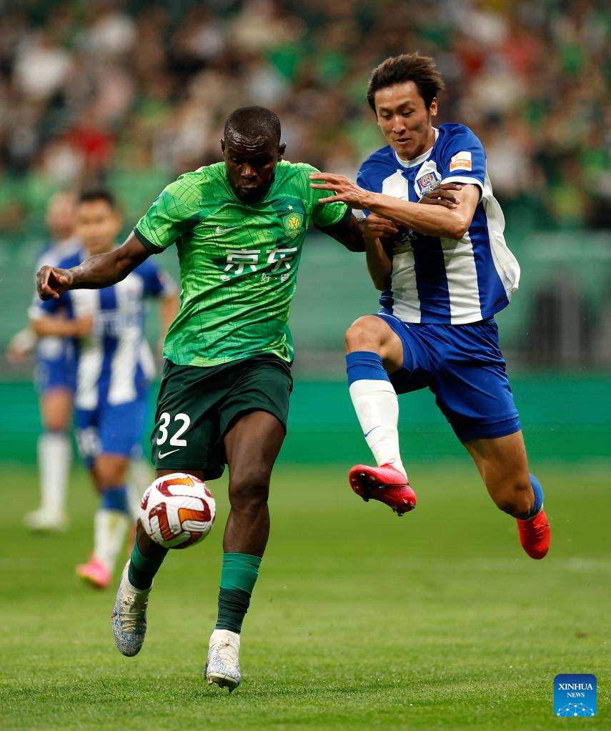 Michael Ngadeu (L, front) of Beijing Guoan competes during a 2023 season Chinese Football Association Super League (CSL) 6th round match between Beijing Guoan and Tianjin Jinmen Tigers at the Worker's Stadium in Beijing, capital of China, May 10, 2023. (Xinhua/Wang Lili)