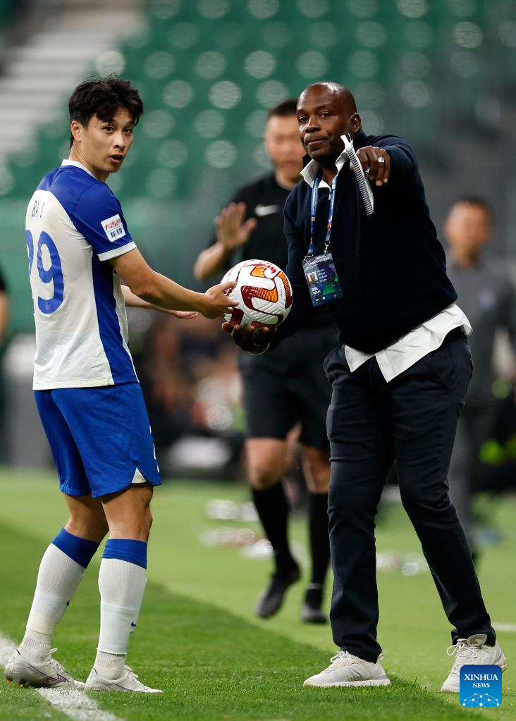 Stanley Menzo, head coach of Beijing Guoan, reacts with Ba Dun of Tianjin Jinmen Tigers during a 2023 season Chinese Football Association Super League (CSL) 6th round match between Beijing Guoan and Tianjin Jinmen Tigers at the Worker's Stadium in Beijing, capital of China, May 10, 2023. (Xinhua/Wang Lili)