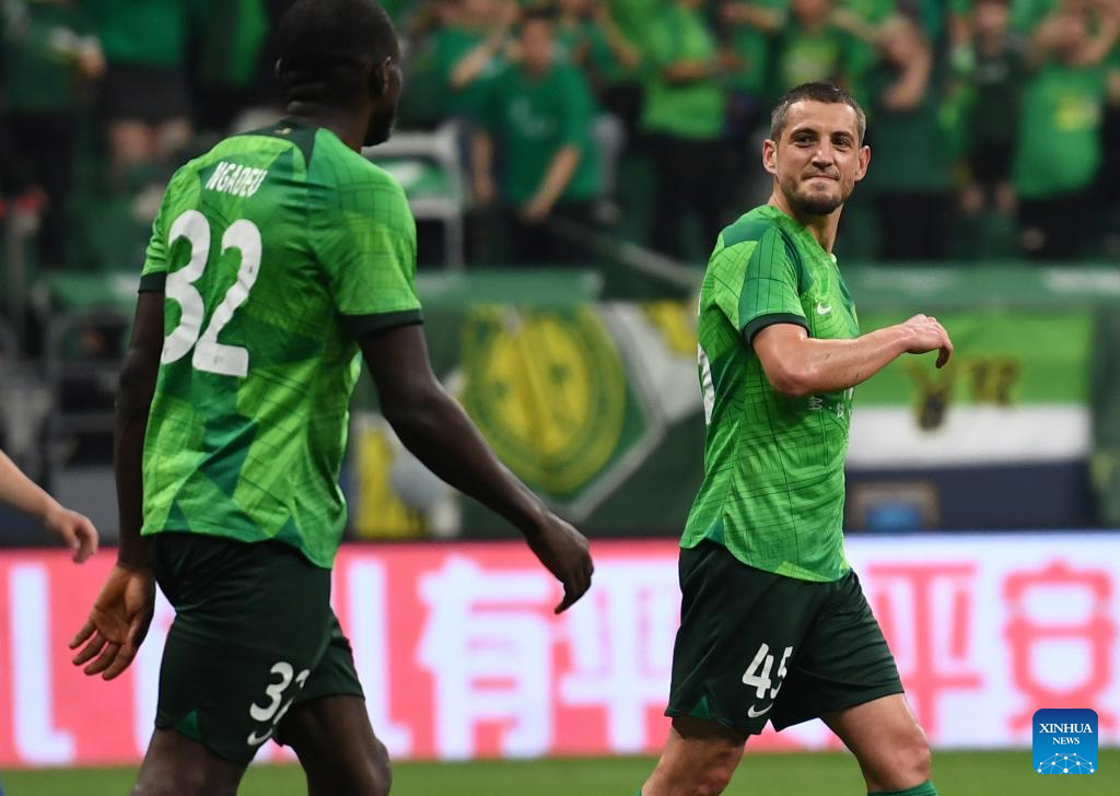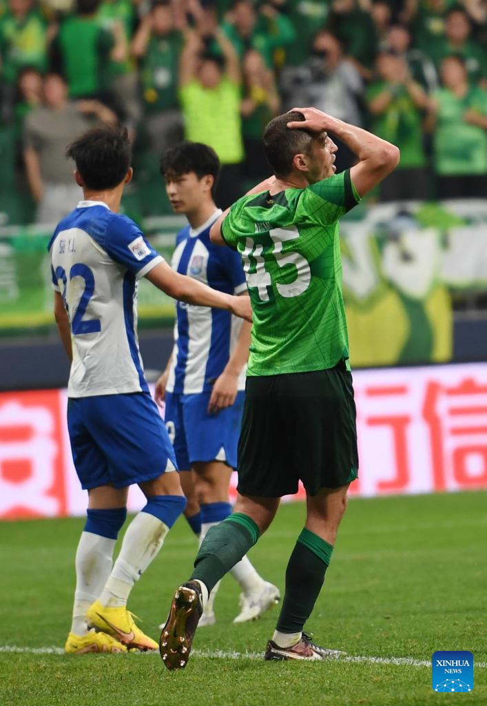 Arijan Ademi (R) of Beijing Guoan reacts during a 2023 season Chinese Football Association Super League (CSL) 6th round match between Beijing Guoan and Tianjin Jinmen Tiger at the Worker's Stadium in Beijing, capital of China, May 10, 2023. (Xinhua/Kong Hui)