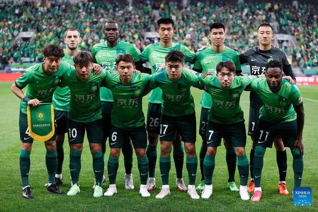 Starting players of Beijing Guoan line up prior to a 2023 season Chinese Football Association Super League (CSL) 6th round match between Beijing Guoan and Tianjin Jinmen Tigers at the Worker's Stadium in Beijing, capital of China, May 10, 2023. (Xinhua/Wang Lili)