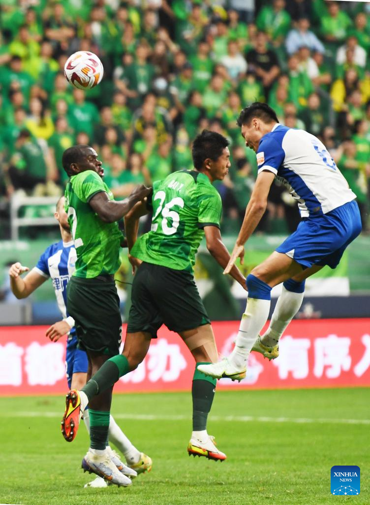 Michael Ngadeu (L,front) of Beijing Guoan vies for a header during a 2023 season Chinese Football Association Super League (CSL) 6th round match between Beijing Guoan and Tianjin Jinmen Tiger at the Worker's Stadium in Beijing, capital of China, May 10, 2023. (Xinhua/Kong Hui)