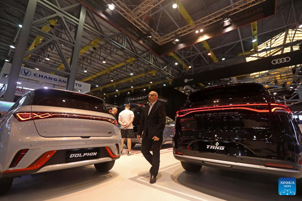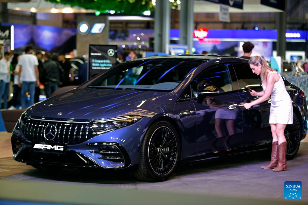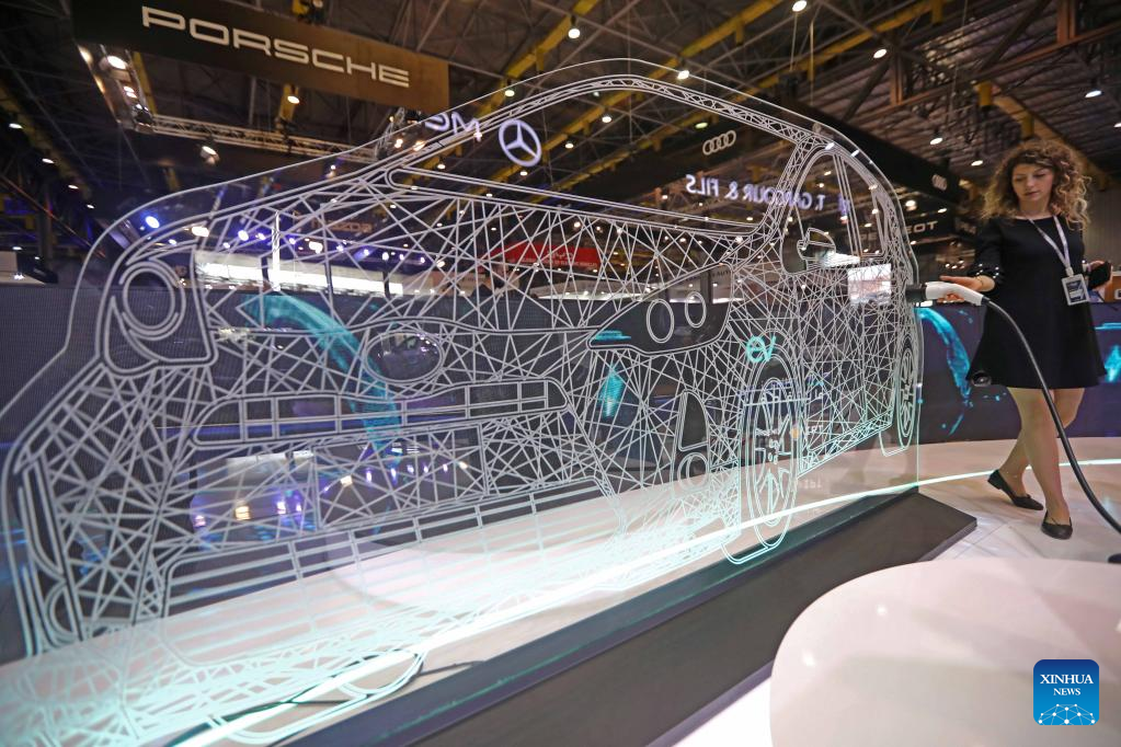 People visit the e-MotorShow 2023 in Beirut, Lebanon, on May 10, 2023. The e-MotorShow Middle East was held in Beirut from May 10 to 14. (Xinhua/Liu Zongya)