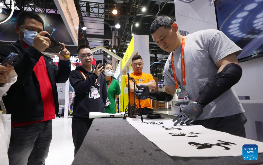 A staff member displays how to write in calligraphy with brain-controlled prosthetic arm at the Exposition on China Brand 2023 in east China's Shanghai, May 10, 2023. The Exposition on China Brand 2023 kicked off Wednesday at the Shanghai World Expo Exhibition and Convention Center. Around 1,000 Chinese enterprises participated in the exposition, showcasing the new look of current Chinese brands to the world. (Xinhua/Fang Zhe)