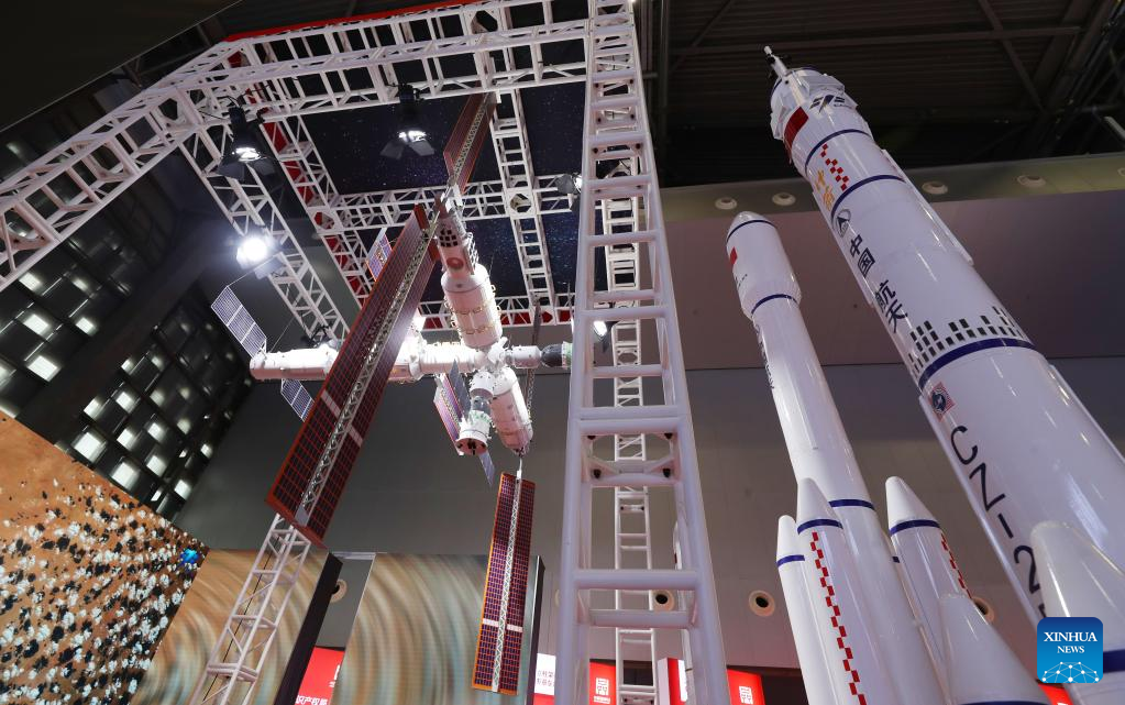This photo taken on May 10, 2023 shows a model of China's space station and a series of models of China's Long March rocket family at the Exposition on China Brand 2023 in east China's Shanghai. The Exposition on China Brand 2023 kicked off Wednesday at the Shanghai World Expo Exhibition and Convention Center. Around 1,000 Chinese enterprises participated in the exposition, showcasing the new look of current Chinese brands to the world. (Xinhua/Fang Zhe)
