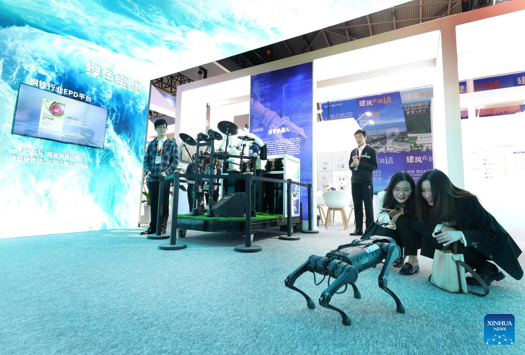 Visitors interact with a four-legged robot at the Exposition on China Brand 2023 in east China's Shanghai, May 10, 2023. The Exposition on China Brand 2023 kicked off Wednesday at the Shanghai World Expo Exhibition and Convention Center. Around 1,000 Chinese enterprises participated in the exposition, showcasing the new look of current Chinese brands to the world. (Xinhua/Fang Zhe)