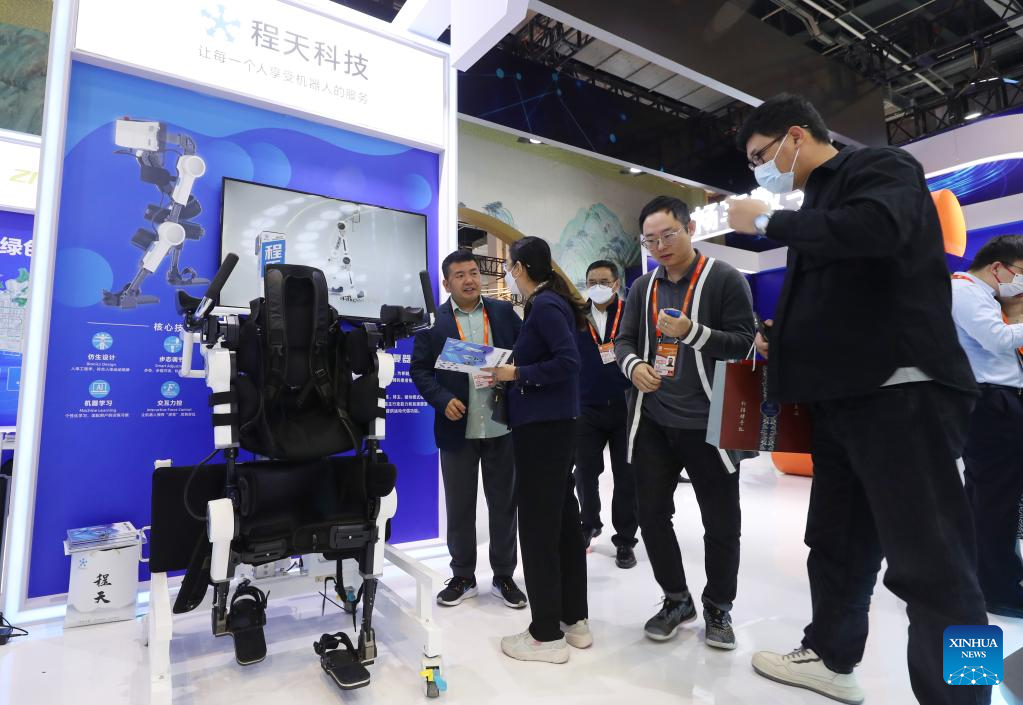 Visitors learn about rehabilitation products at the Exposition on China Brand 2023 in east China's Shanghai, May 10, 2023. The Exposition on China Brand 2023 kicked off Wednesday at the Shanghai World Expo Exhibition and Convention Center. Around 1,000 Chinese enterprises participated in the exposition, showcasing the new look of current Chinese brands to the world.(Xinhua/Fang Zhe)