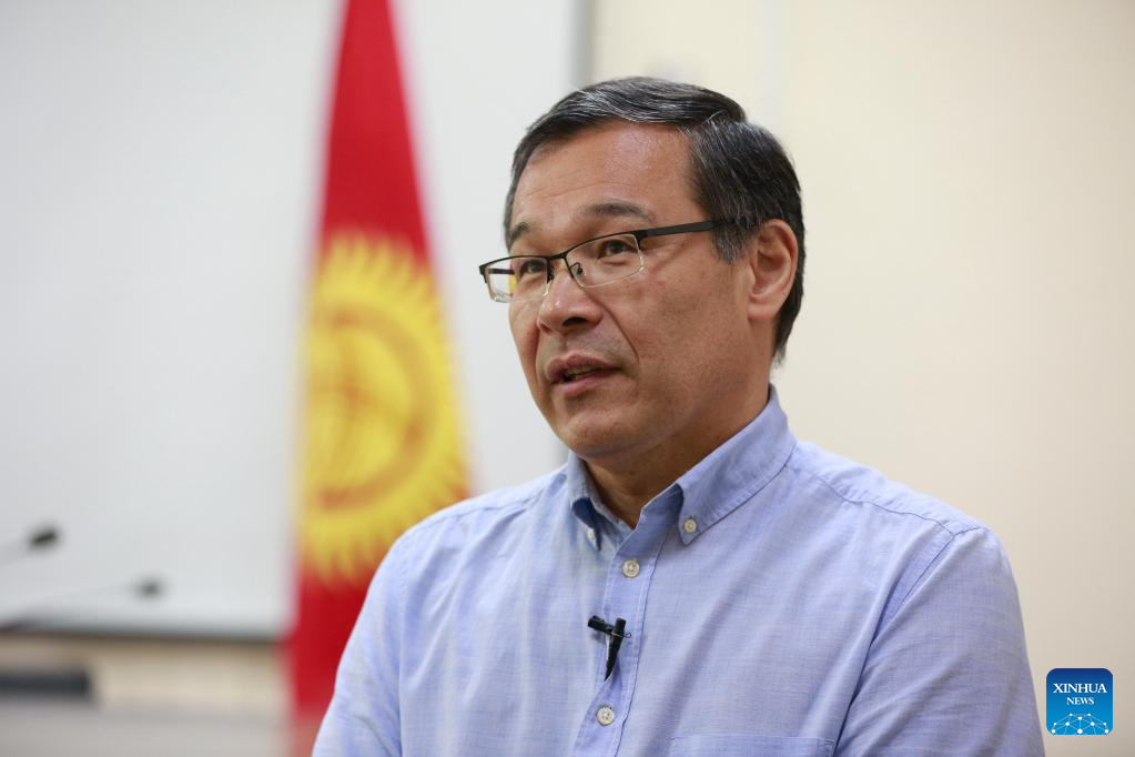Sherdali Baktygulov, an expert from the National Institute for Strategic Studies of the Kyrgyz Republic, speaks during an interview with Xinhua in Bishkek, Kyrgyzstan, April 27, 2023. A new highway built by China within the framework of the Belt and Road Initiative (BRI) will not only help Kyrgyzstan in economic development through boosting road connectivity, but also create international transport corridors that will promote growth throughout Central Asia, Kyrgyz specialists have said. (Photo by Roman/Xinhua)