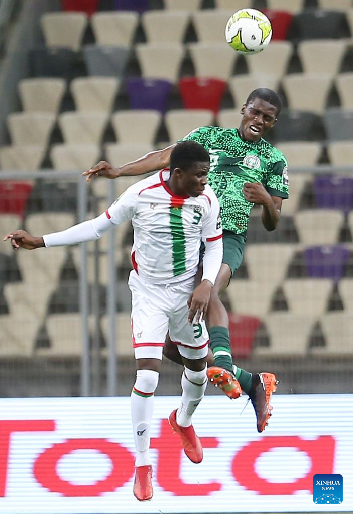 Burkina Faso's Aboubacar Camara (L) vies for a header with Nigeria's Hope Linus during the U17 Africa Cup of Nations quarterfinal match in Algiers, Algeria, May 11, 2023. (Xinhua)