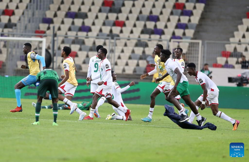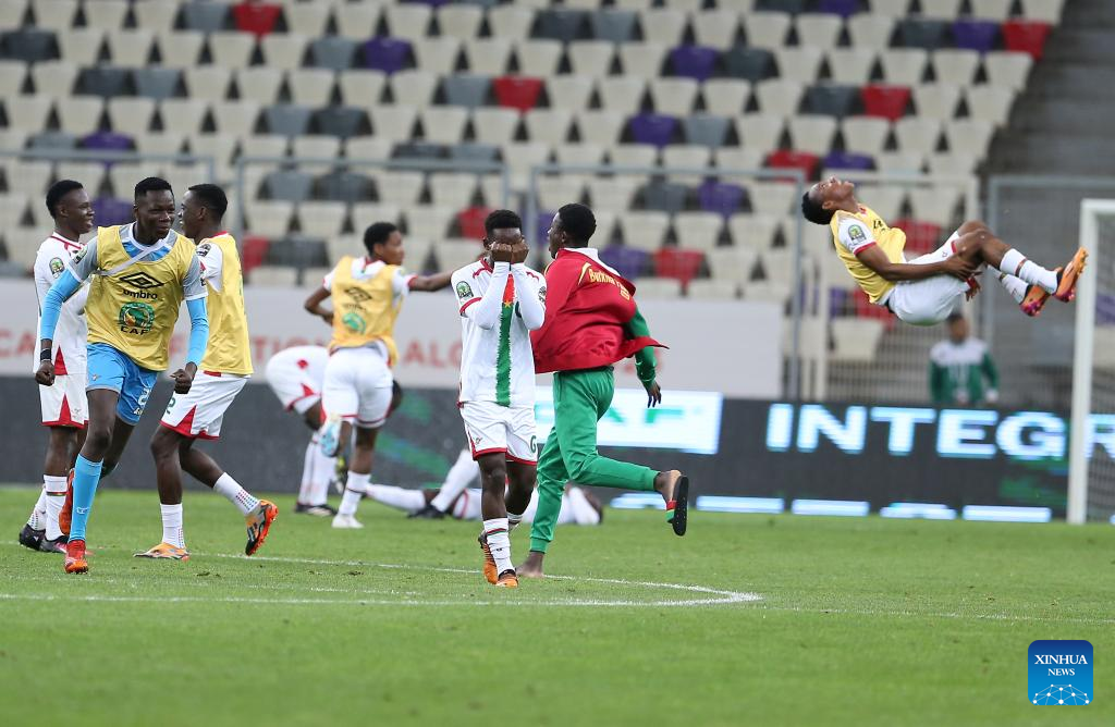 Burkina Faso's players celebrate after winning the U17 Africa Cup of Nations quarterfinal match between Nigeria and Burkina Faso in Algiers, Algeria, May 11, 2023. (Xinhua)