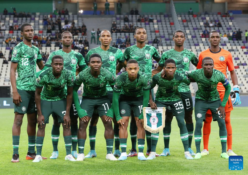 Nigeria's line-up players pose for a group photo ahead of the U17 Africa Cup of Nations quarterfinal match between Nigeria and Burkina Faso in Algiers, Algeria, May 11, 2023. (Xinhua)