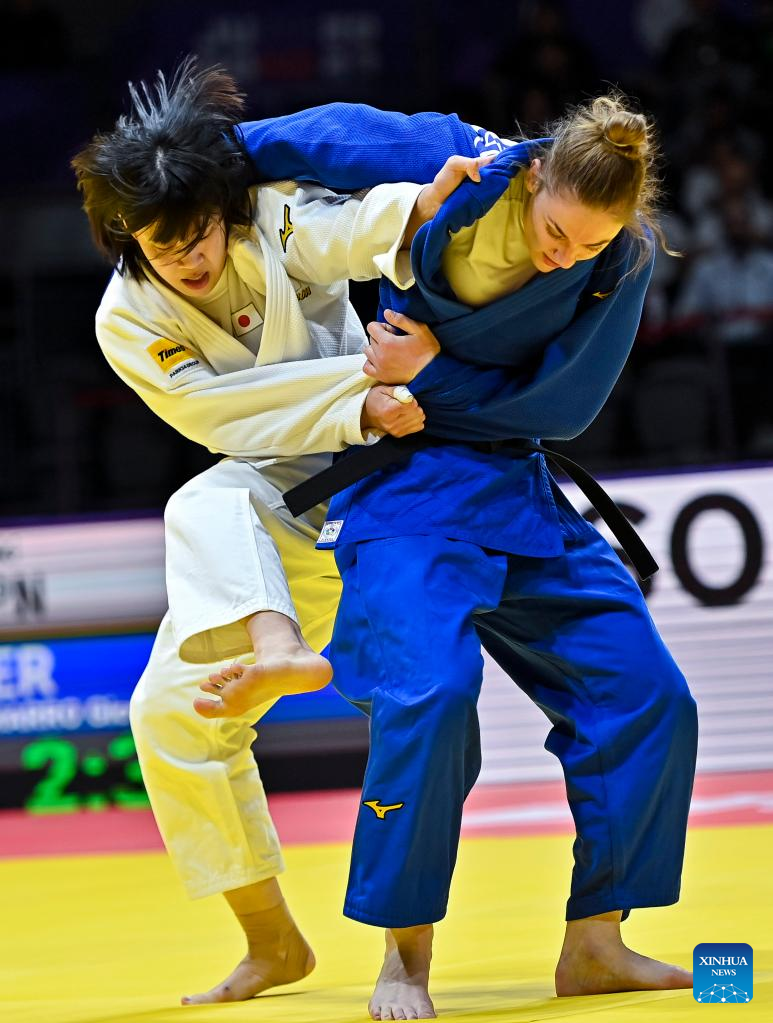 Niizoe Saki (L) of Japan and Giovanna Scoccimarro of Germany compete during the women's 70kg category gold medal match at the World Judo Championships Doha 2023 in Doha, Qatar on May 11, 2023. (Photo by Nikku/Xinhua)