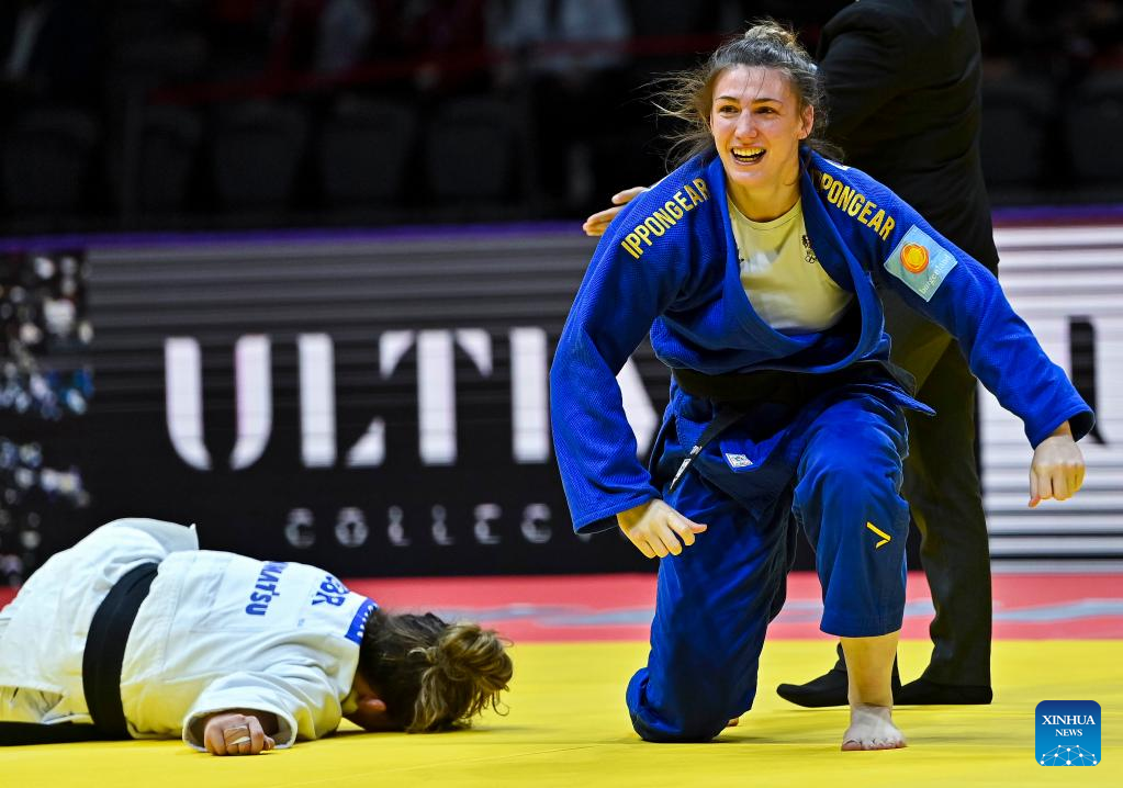 Michaela Polleres (R) of Austria reacts after winning the women's 70kg category bronze medal match against Katie-Jemima Yeats-Brown of Great Britain at the World Judo Championships Doha 2023 in Doha, Qatar on May 11, 2023. (Photo by Nikku/Xinhua)