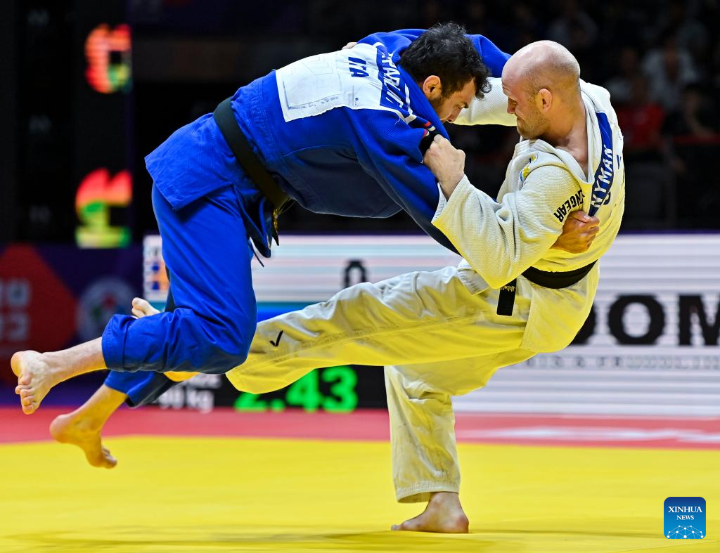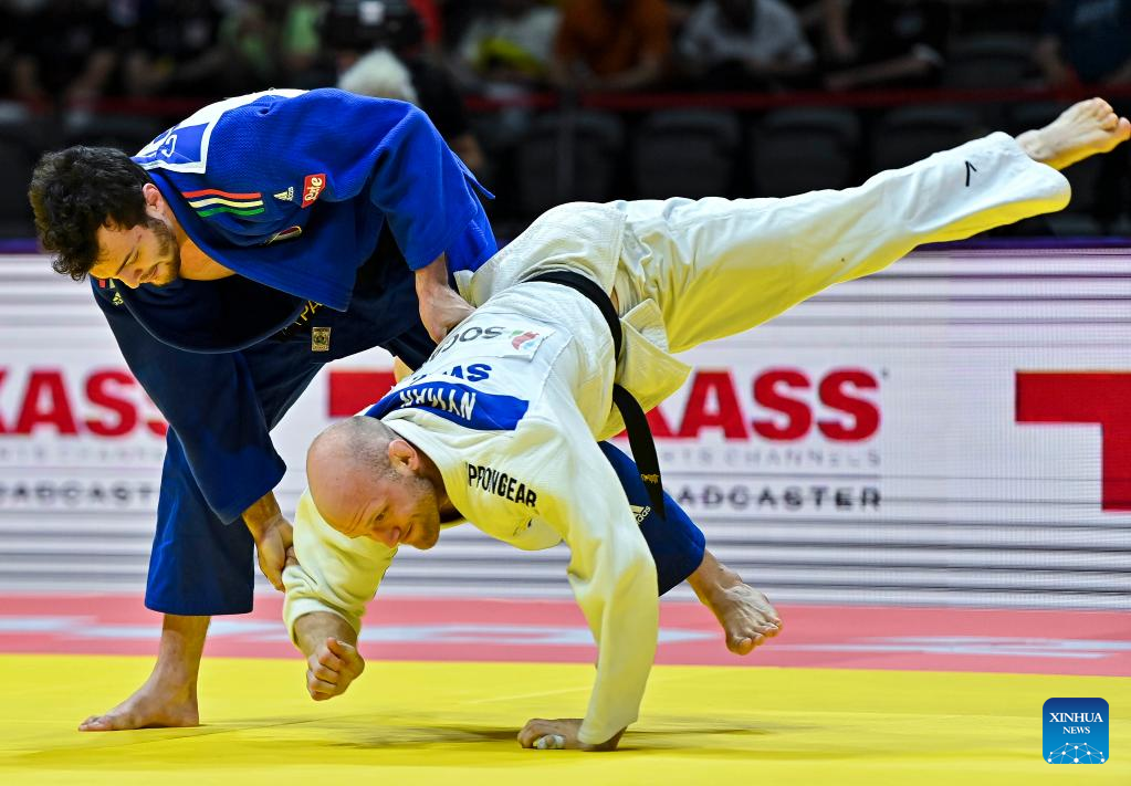 Marcus Nyman (R) of Sweden and Christian Parlati of Italy compete during the men's 90kg category bronze medal match at the World Judo Championships Doha 2023 in Doha, Qatar on May 11, 2023. (Photo by Nikku/Xinhua)