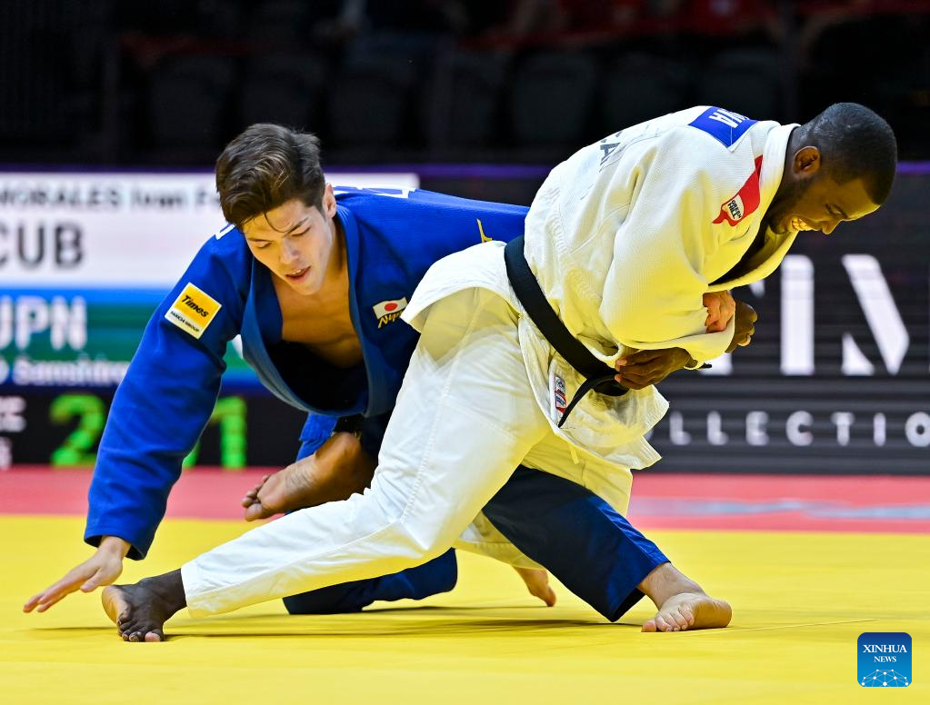 Murao Sanshiro (L) of Japan and Ivan Felipe Silva Morales of Cuba compete during the men's 90kg category bronze medal match at the World Judo Championships Doha 2023 in Doha, Qatar on May 11, 2023. (Photo by Nikku/Xinhua)