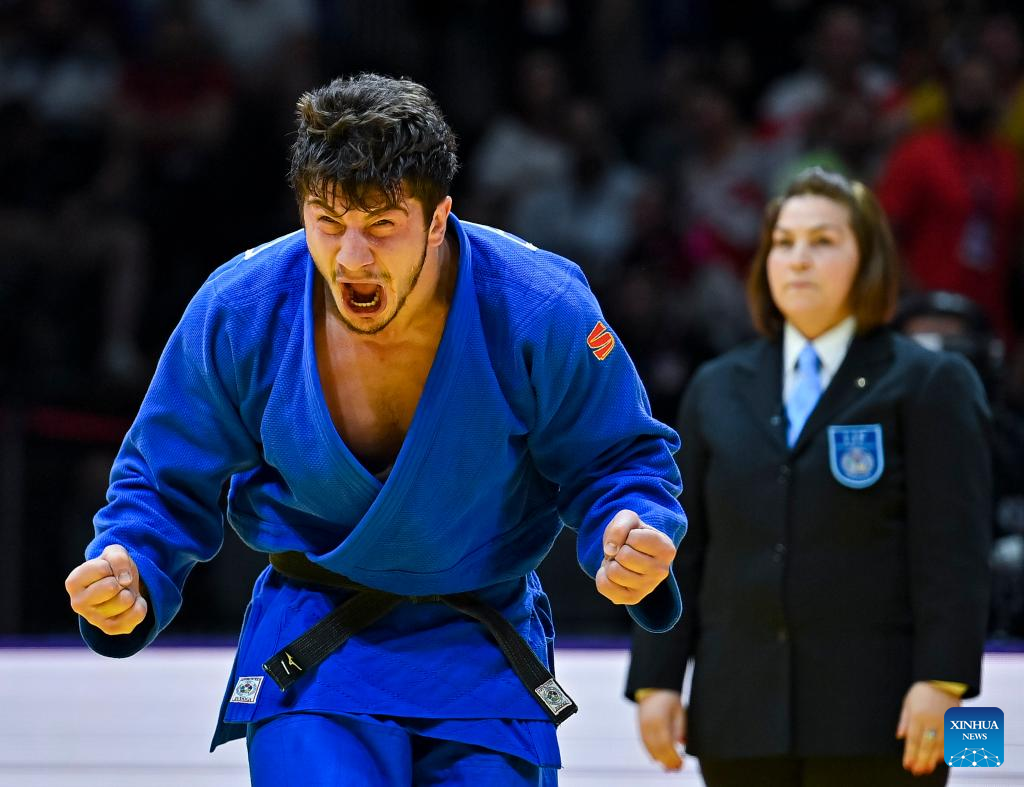 Luka Maisuradze of Georgia reacts after winning the men's 90kg category gold medal match against Lasha Bekauri of Georgia at the World Judo Championships Doha 2023 in Doha, Qatar on May 11, 2023. (Photo by Nikku/Xinhua)