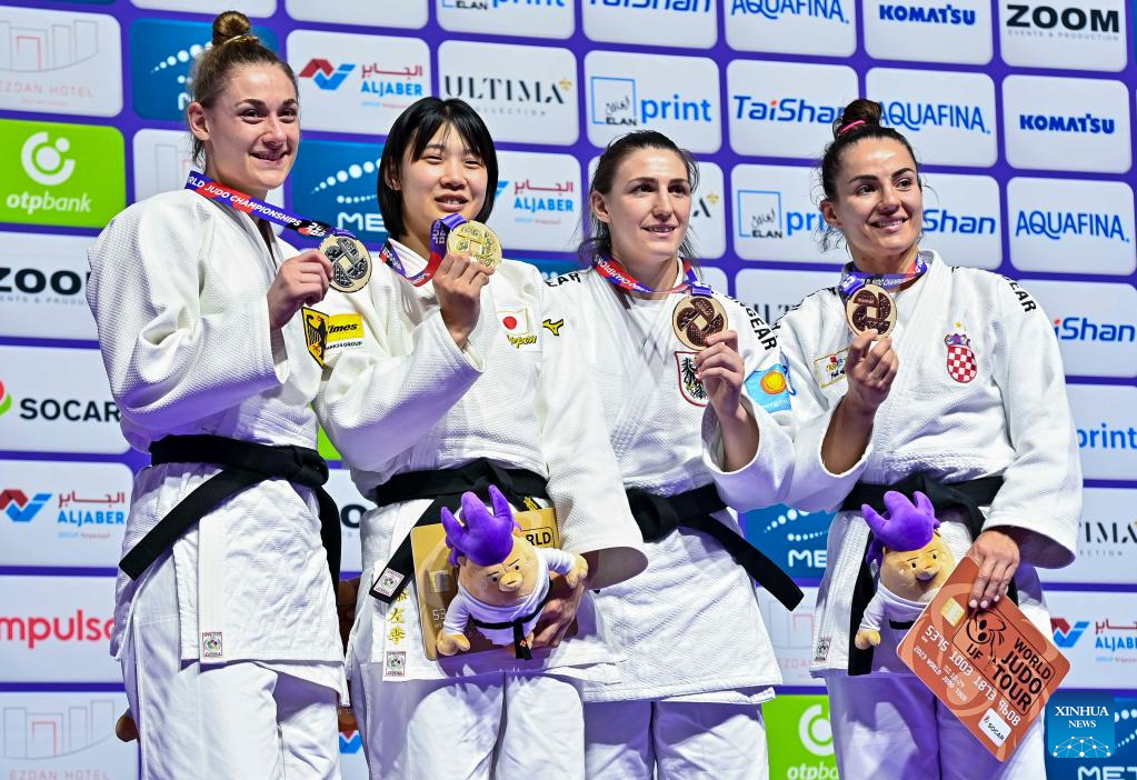 Gold medalist Niizoe Saki (2nd L) of Japan, silver medalist Giovanna Scoccimarro (1st L) of Germany, bronze medalists Michaela Polleres (2nd R) of Austria and Barbara Matic of Croatia pose on the podium during the awarding ceremony of the women's 70kg category at the World Judo Championships Doha 2023 in Doha, Qatar on May 11, 2023. (Photo by Nikku/Xinhua)