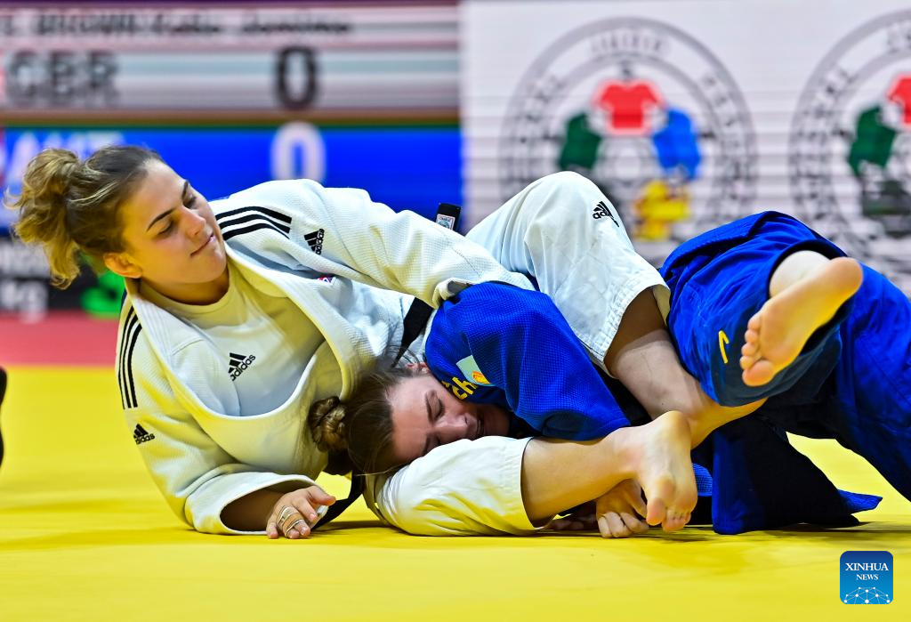 Katie-Jemima Yeats-Brown (L) of Great Britain and Michaela Polleres of Austria compete during the women's 70kg category bronze medal match at the World Judo Championships Doha 2023 in Doha, Qatar on May 11, 2023. (Photo by Nikku/Xinhua)
