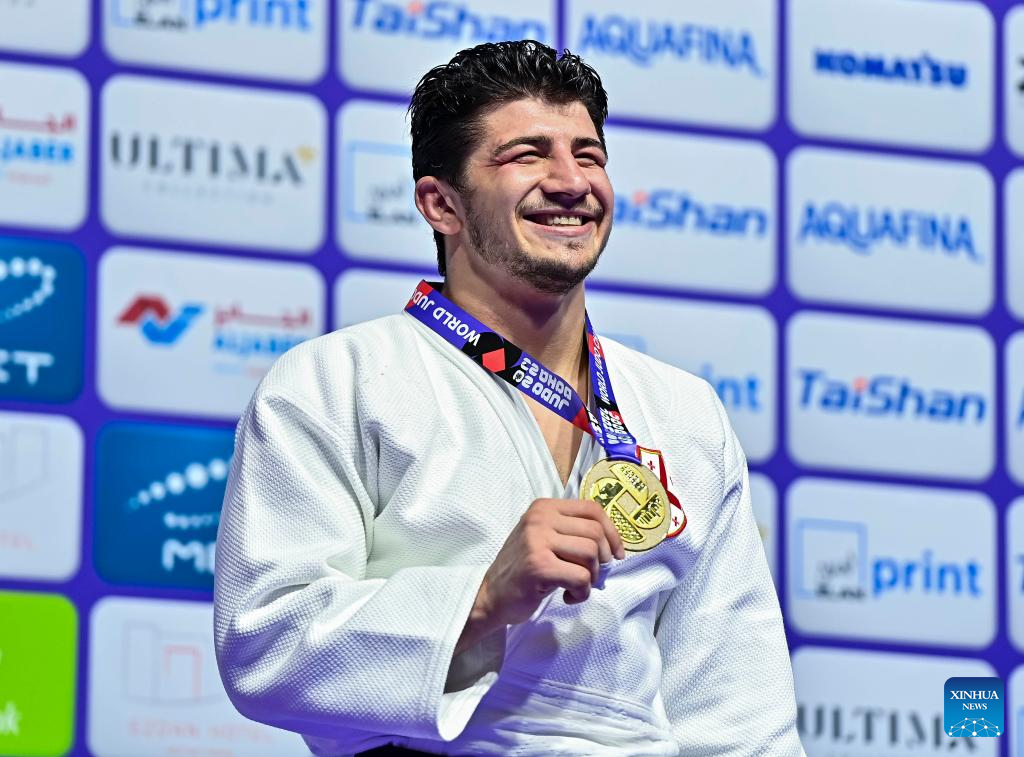 Gold medalist Luka Maisuradze of Georgia poses on the podium during the awarding ceremony of the men's 90kg category at the World Judo Championships Doha 2023 in Doha, Qatar on May 11, 2023. (Photo by Nikku/Xinhua)