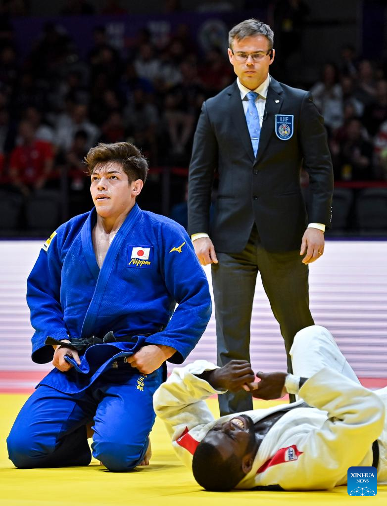 Murao Sanshiro (L) of Japan reacts after winning the men's 90kg category bronze medal match against Ivan Felipe Silva Morales (R) of Cuba at the World Judo Championships Doha 2023 in Doha, Qatar on May 11, 2023. (Photo by Nikku/Xinhua)
