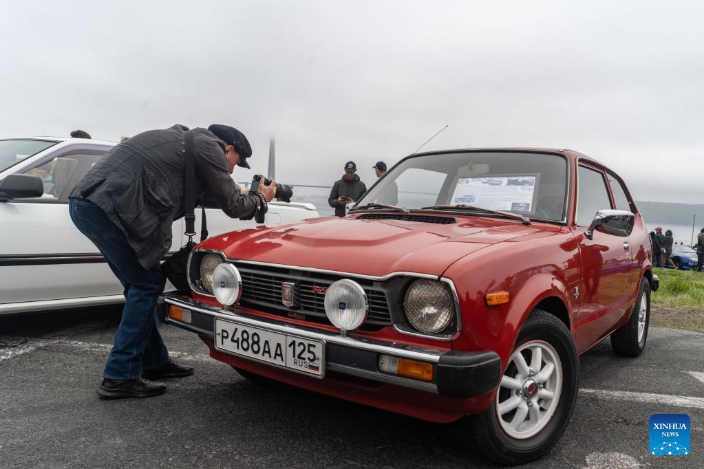 Vehicles are displayed during an exhibition of classic cars in Vladivostok, Russia, May 13, 2023. (Photo by Guo Feizhou/Xinhua)