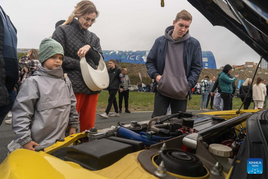 People look at a vehicle during an exhibition of classic cars in Vladivostok, Russia, May 13, 2023. (Photo by Guo Feizhou/Xinhua)