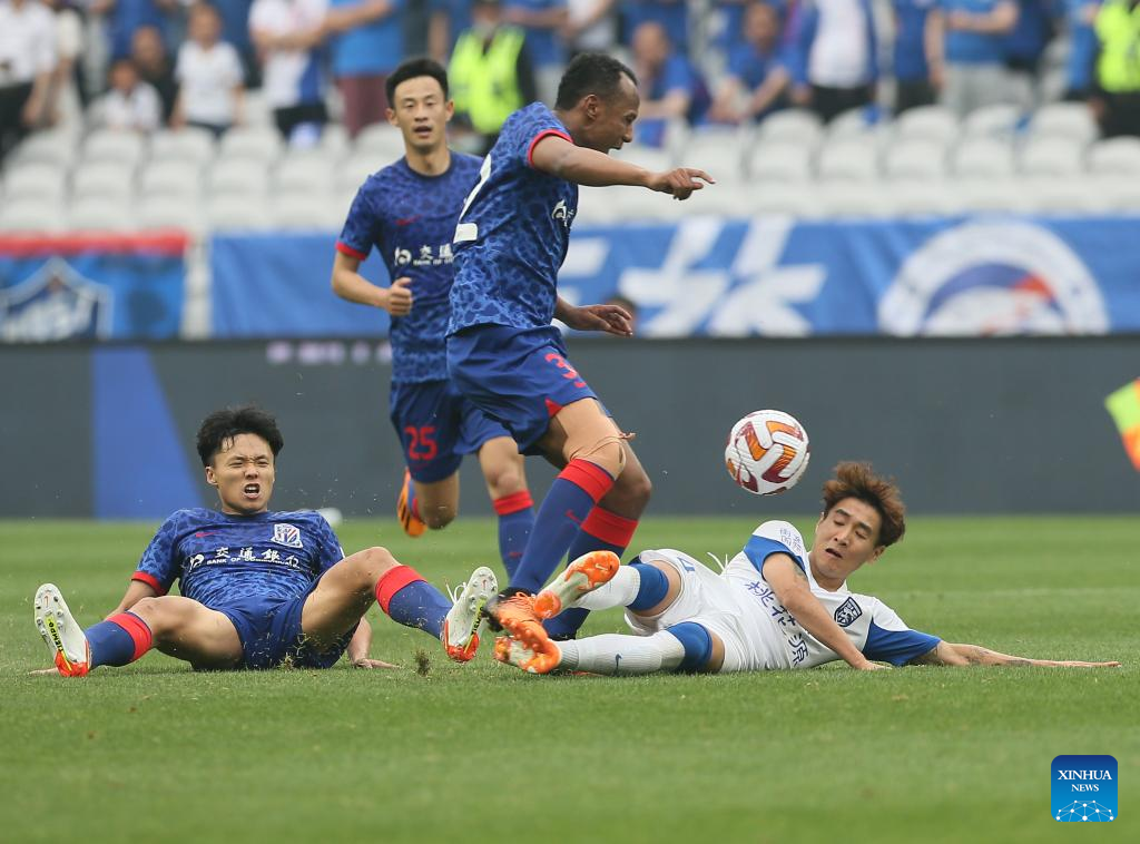 Aidi Fulangxisi (2nd R) of Shanghai Shenhua vies with Wei Shiyao (1st R) of Wuhan Three Towns during a 2023 season Chinese Football Association Super League (CSL) match between Shanghai Shenhua and Wuhan Three Towns in east China's Shanghai Municipality on May 13, 2023. (Xinhua/Ding Ting)