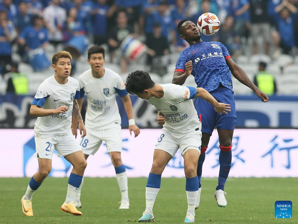 Jin Yangyang (1st R) of Shanghai Shenhua vies for a header with Abdul-Aziz Yakubu (3rd R) of Wuhan Three Towns during a 2023 season Chinese Football Association Super League (CSL) match between Shanghai Shenhua and Wuhan Three Towns in east China's Shanghai Municipality on May 13, 2023. (Xinhua/Ding Ting)