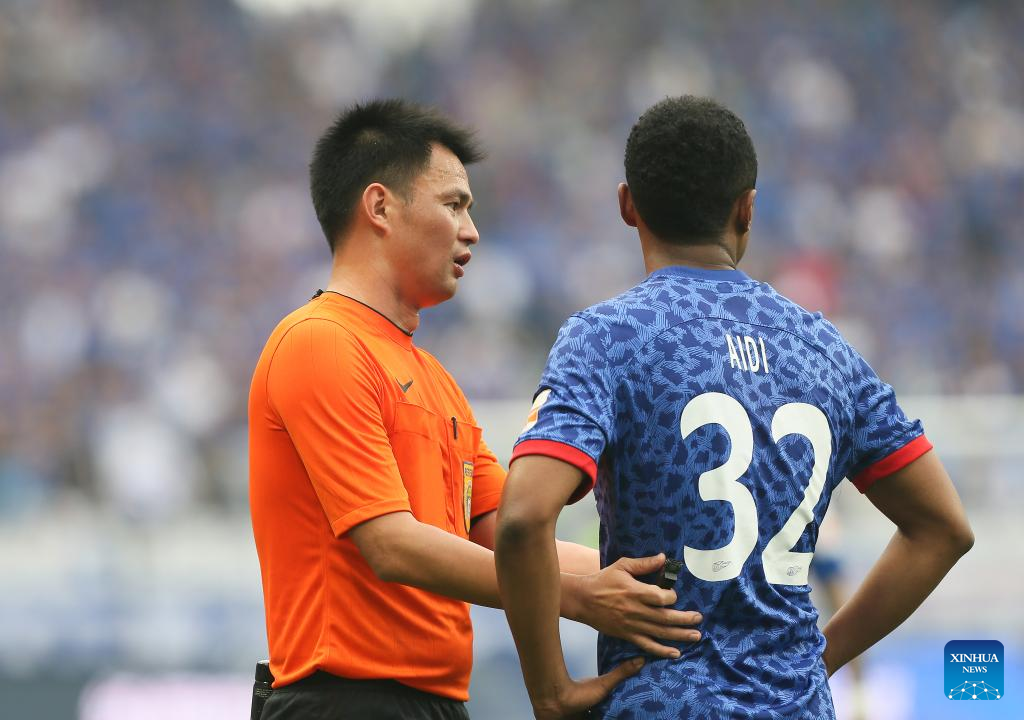 Referee Li Haixin (L) talks with Aidi Fulangxisi of Shanghai Shenhua during a 2023 season Chinese Football Association Super League (CSL) match between Shanghai Shenhua and Wuhan Three Towns in east China's Shanghai Municipality on May 13, 2023. (Xinhua/Ding Ting)