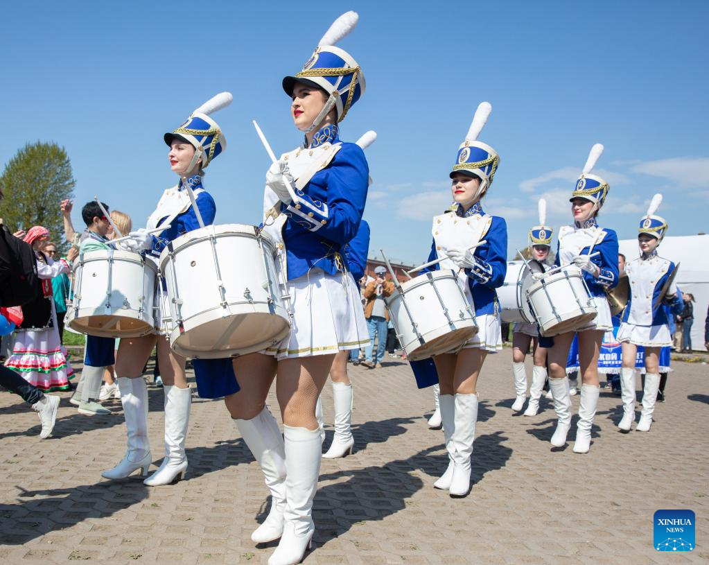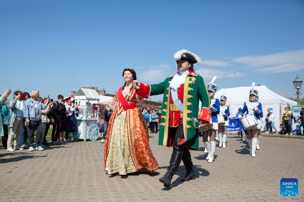 Actors perform at the smelt fest in St. Petersburg, Russia, May 13, 2023. St. Petersburg started its annual smelt fest at the Peter and Paul Fortress on Saturday. Guests have chance to sample freshly cooked smelt fish, enjoy musical concerts and participate in various activities. (Photo by Irina Motina/Xinhua)