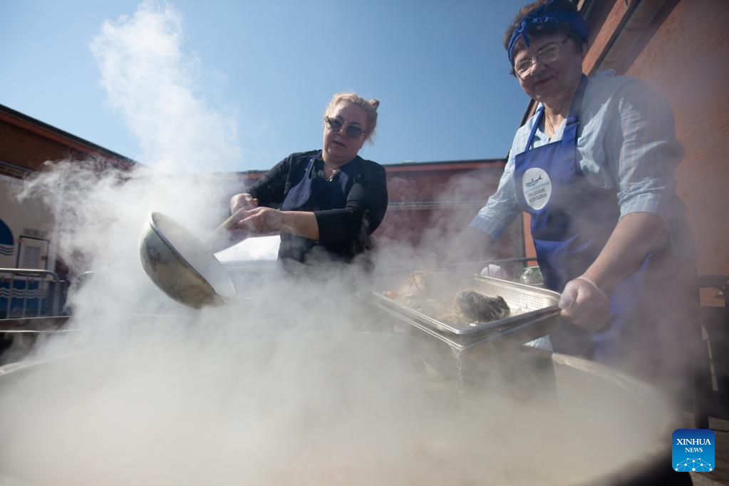People cook smelt fish at the smelt fest in St. Petersburg, Russia, May 13, 2023. St. Petersburg started its annual smelt fest at the Peter and Paul Fortress on Saturday. Guests have chance to sample freshly cooked smelt fish, enjoy musical concerts and participate in various activities. (Photo by Irina Motina/Xinhua)