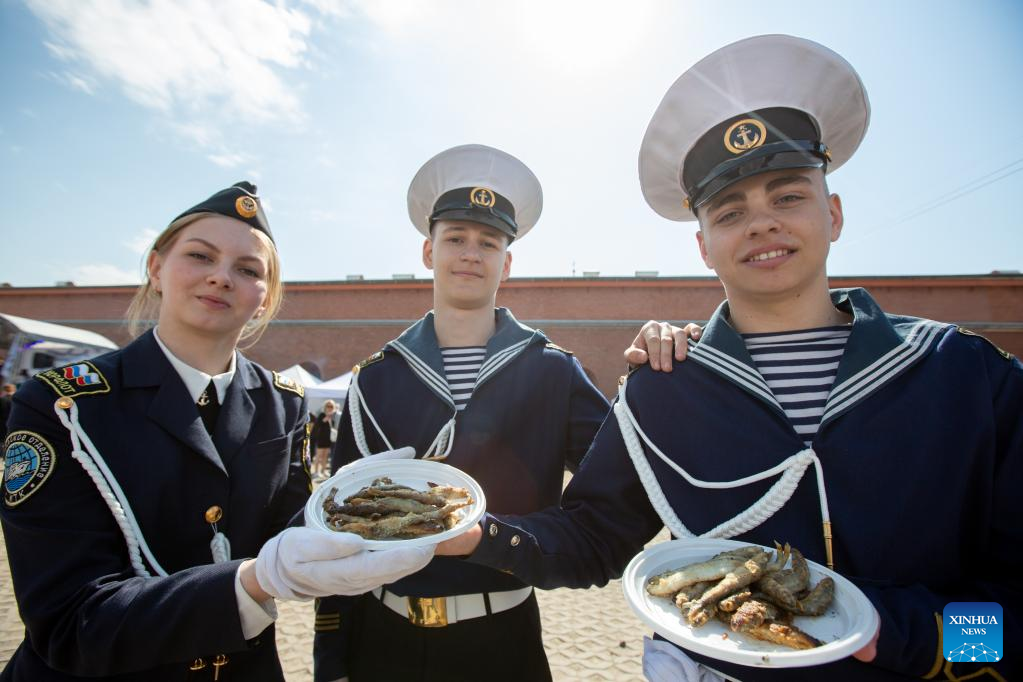 People in uniforms present cooked at the smelt fest in St. Petersburg, Russia, May 13, 2023. St. Petersburg started its annual smelt fest at the Peter and Paul Fortress on Saturday. Guests have chance to sample freshly cooked smelt fish, enjoy musical concerts and participate in various activities. (Photo by Irina Motina/Xinhua)