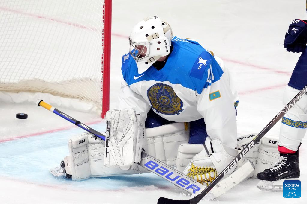 Kazakhstan's goalkeeper Andrey Shutov tries to make a save during the Group B match between Norway and Kazakhstan at the 2023 IIHF Ice Hockey World Championship in Riga, Latvia, May 13, 2023. (Photo by Edijs Palens/Xinhua)