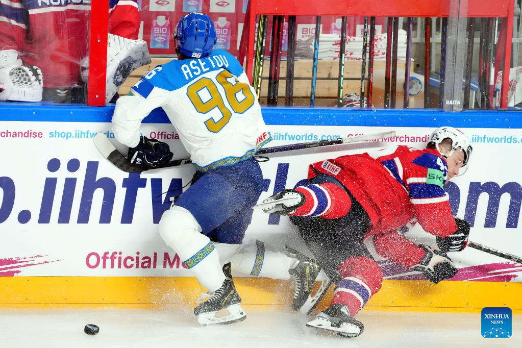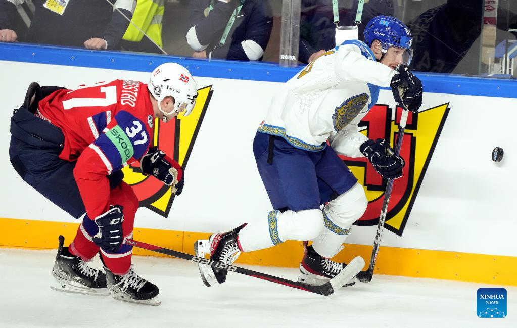 Norway's defendsman Christian Kaasastul (R) vies with Kazakhstan's forward Alikhan Asetov during the Group B match between Norway and Kazakhstan at the 2023 IIHF Ice Hockey World Championship in Riga, Latvia, May 13, 2023. (Photo by Edijs Palens/Xinhua)