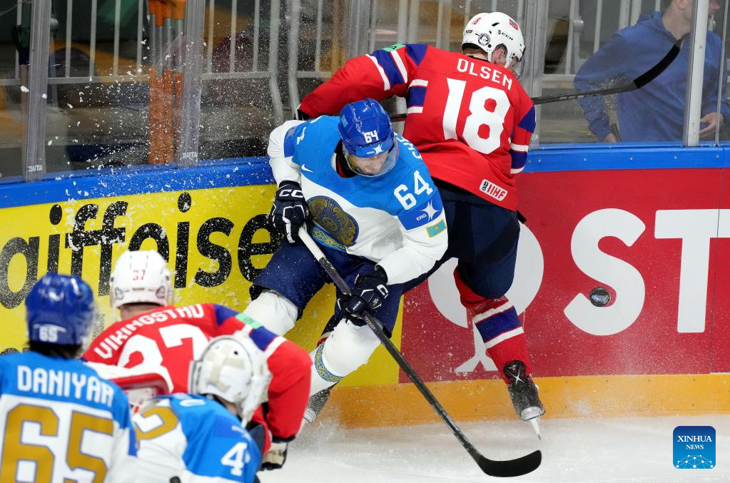 Norway's forward Thomas Olsen (1st R) vies with Kazakhstan's forward Arkadi Shestakov (2nd R) during the Group B match between Norway and Kazakhstan at the 2023 IIHF Ice Hockey World Championship in Riga, Latvia, May 13, 2023. (Photo by Edijs Palens/Xinhua)