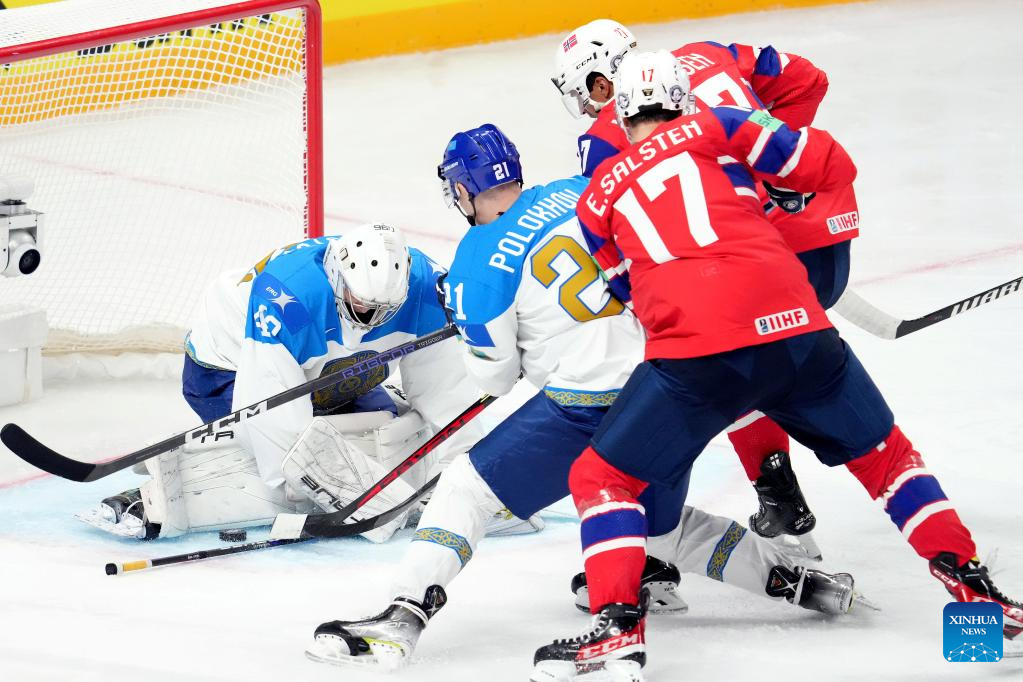 Kazakhstan's goalkeeper Andrey Shutov (1st L) tries to make a save during the Group B match between Norway and Kazakhstan at the 2023 IIHF Ice Hockey World Championship in Riga, Latvia, May 13, 2023. (Photo by Edijs Palens/Xinhua)