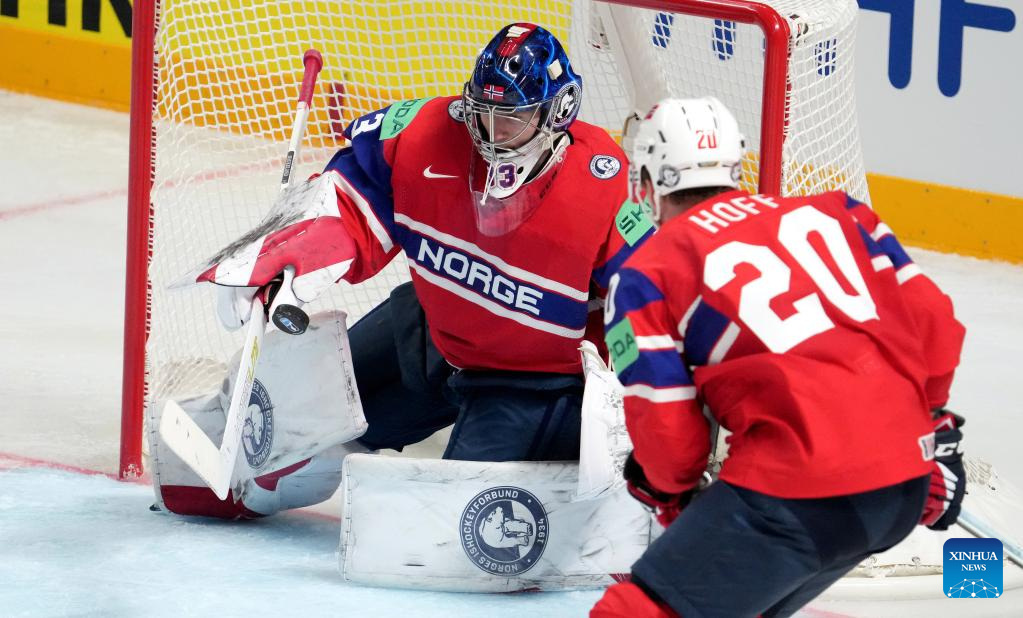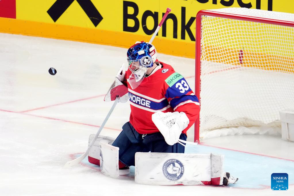 Norway's goalkeeper Henrik Haukeland tries to make a save during the Group B match between Norway and Kazakhstan at the 2023 IIHF Ice Hockey World Championship in Riga, Latvia, May 13, 2023. (Photo by Edijs Palens/Xinhua)