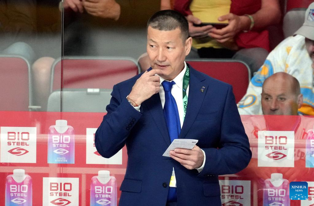 Kazakhstan's head coach Galym Mambetaliev reacts during the Group B match between Norway and Kazakhstan at the 2023 IIHF Ice Hockey World Championship in Riga, Latvia, May 13, 2023. (Photo by Edijs Palens/Xinhua)