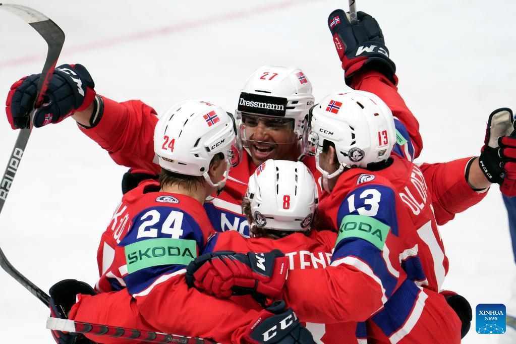 Norway's players celebrate scoring during the Group B match between Norway and Kazakhstan at the 2023 IIHF Ice Hockey World Championship in Riga, Latvia, May 13, 2023. (Photo by Edijs Palens/Xinhua)