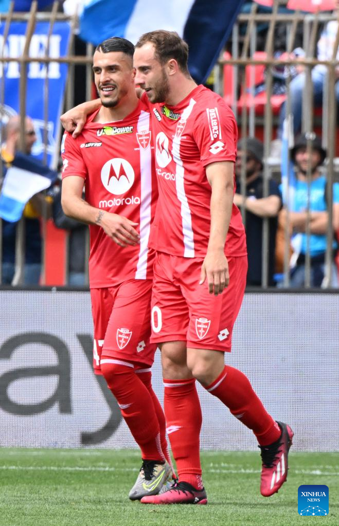Monza's Dany Mota (L) celebrates his goal with Carlo Augusto during a Serie A football match between Napoli and Monza in Monza, Italy, on May 14, 2023. (Photo by Alberto Lingria/Xinhua)