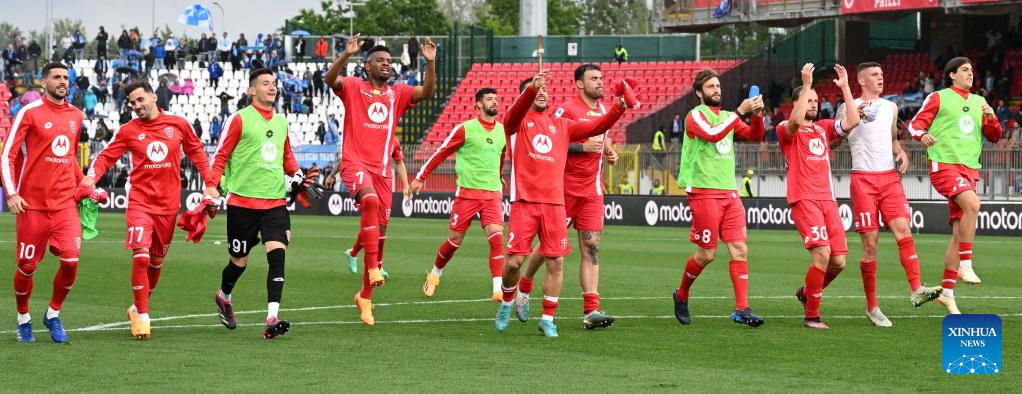 Monza's players celebrate at the end of a Serie A football match between Napoli and Monza in Monza, Italy, on May 14, 2023. (Photo by Alberto Lingria/Xinhua)