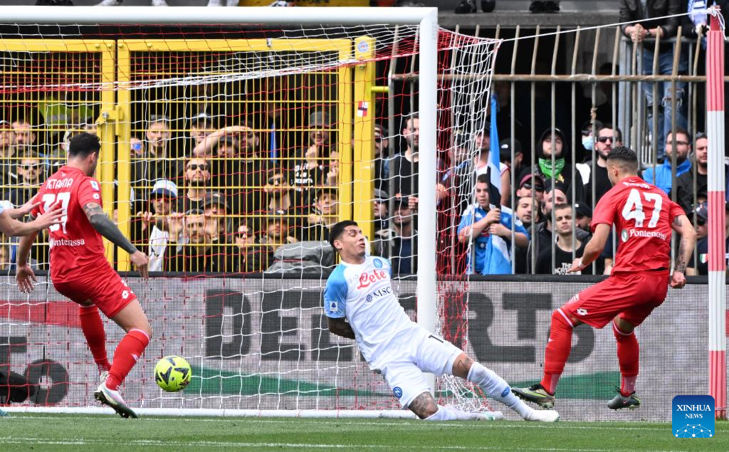 Monza's Dany Mota (1st R) scores his goal during a Serie A football match between Napoli and Monza in Monza, Italy, on May 14, 2023. (Photo by Alberto Lingria/Xinhua)