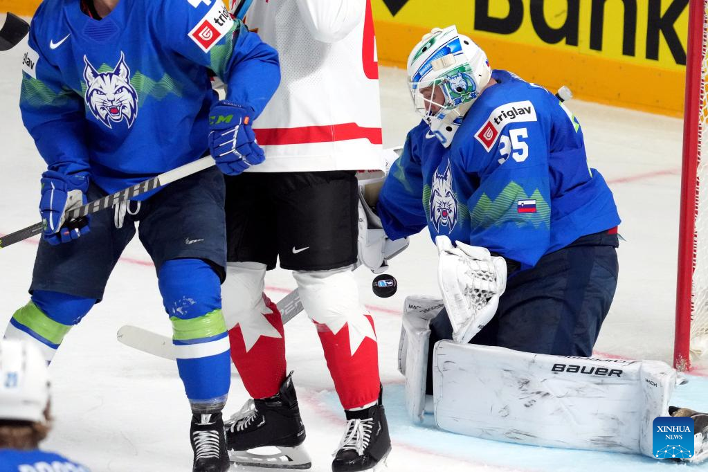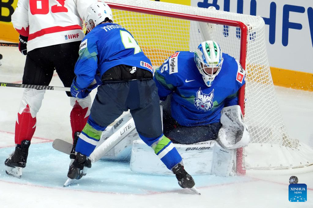Slovenia's goalkeeper Luka Gracnar (R) tries to make a save during the Group B match between Slovenia and Canada at the 2023 IIHF Ice Hockey World Championship in Riga, Latvia, May 14, 2023. (Photo by Edijs Palens/Xinhua)