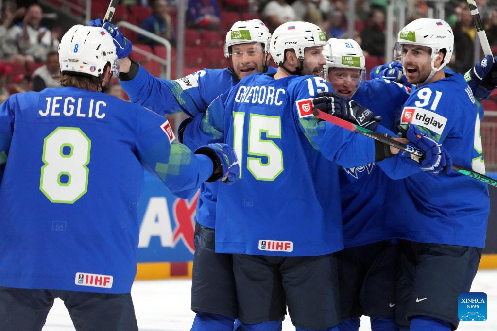 Slovenia's players celebrate after scoring during the Group B match between Slovenia and Canada at the 2023 IIHF Ice Hockey World Championship in Riga, Latvia, May 14, 2023. (Photo by Edijs Palens/Xinhua)