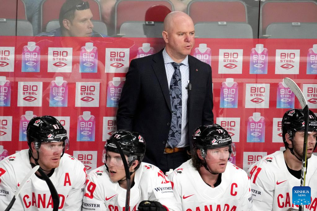 Canada's head coach Andre Tourigny (top) reacts during the Group B match between Slovenia and Canada at the 2023 IIHF Ice Hockey World Championship in Riga, Latvia, May 14, 2023. (Photo by Edijs Palens/Xinhua)