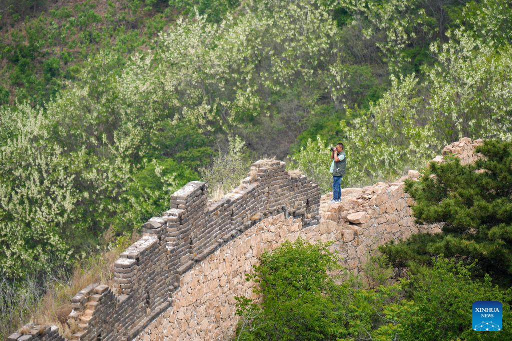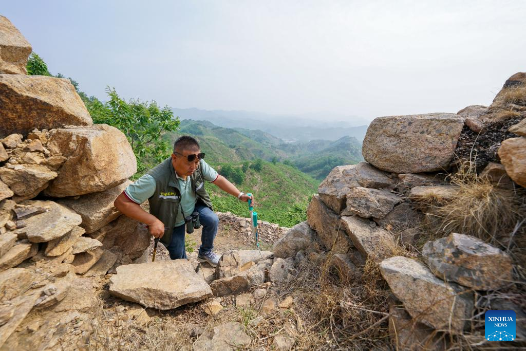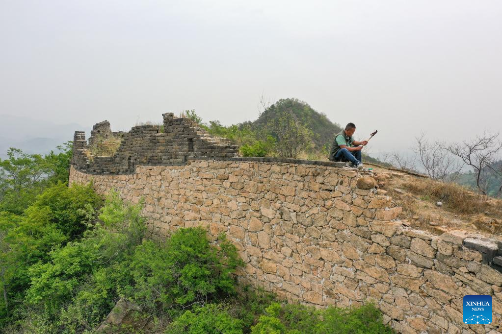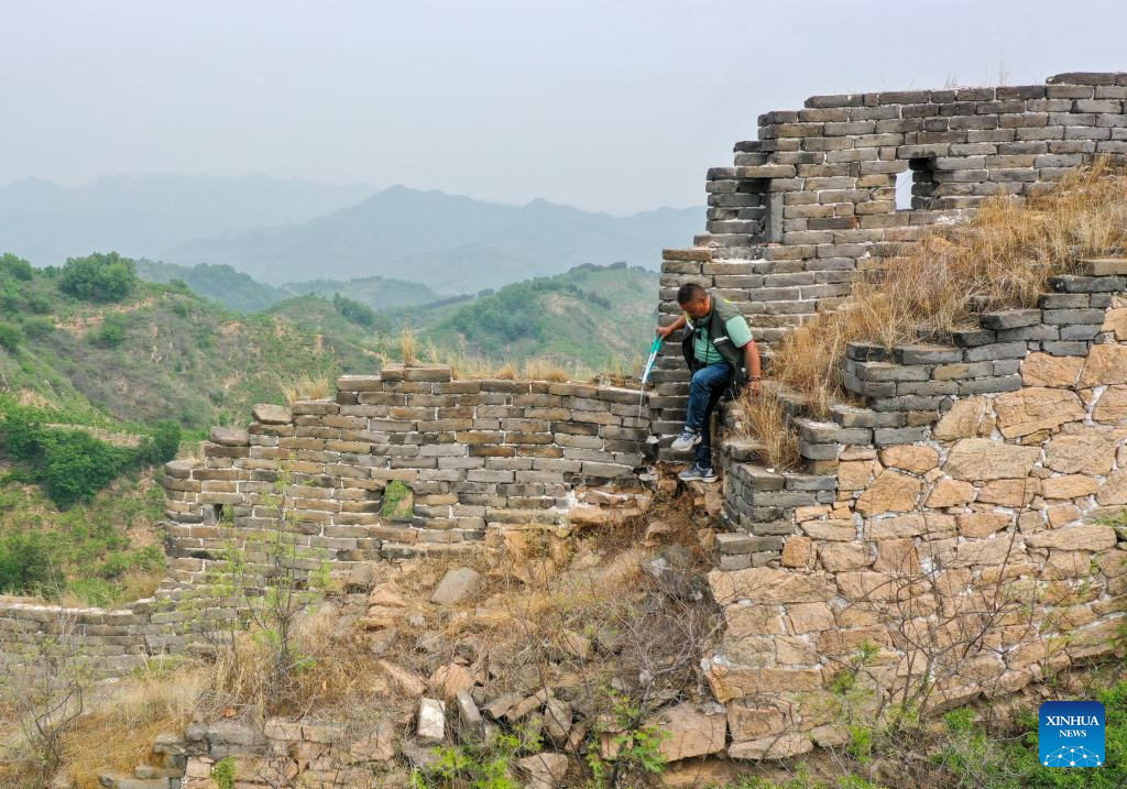 Zhao Chunsheng patrols the Great Wall in Zunhua City, north China's Hebei Province, May 13, 2023. Zhao Chunsheng, 52, is a villager from Qianhouzhangzi Village, Houjiazhai Township of Zunhua City. In 2018, he was hired by local cultural protection department as a Great Wall protector.