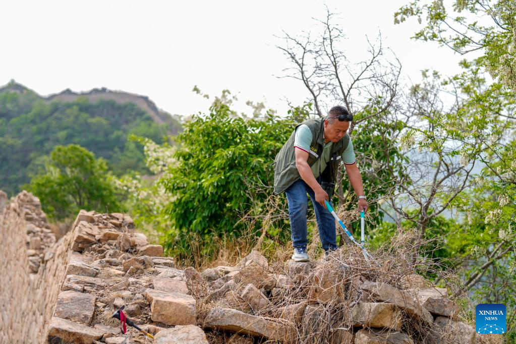 Zhao Chunsheng clears weeds on the Great Wall in Zunhua City, north China's Hebei Province, May 13, 2023. Zhao Chunsheng, 52, is a villager from Qianhouzhangzi Village, Houjiazhai Township of Zunhua City. In 2018, he was hired by local cultural protection department as a Great Wall protector.