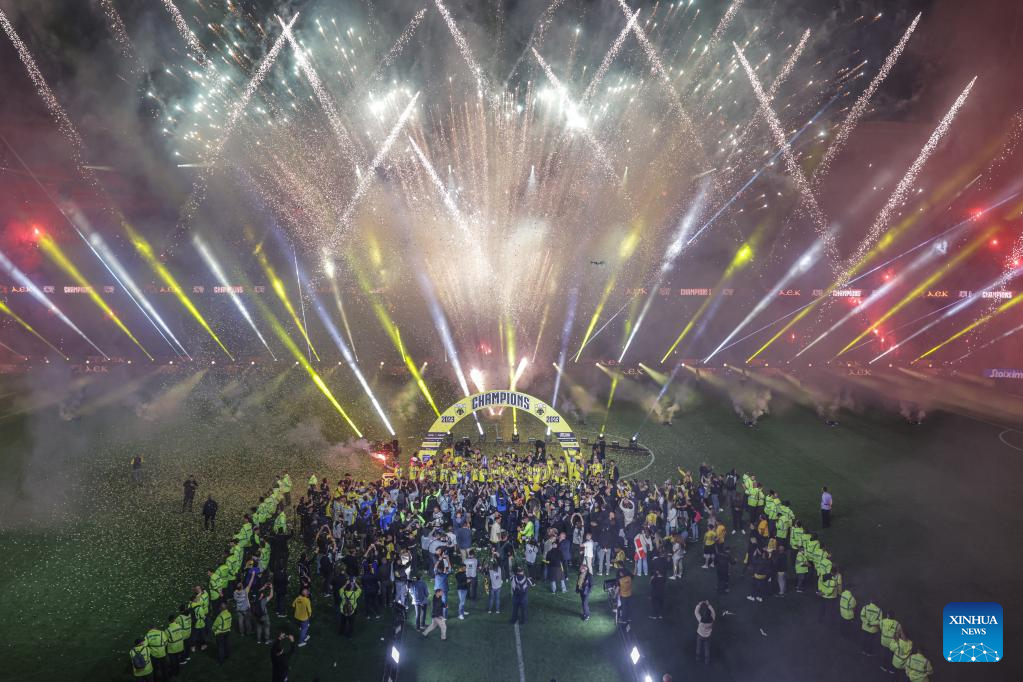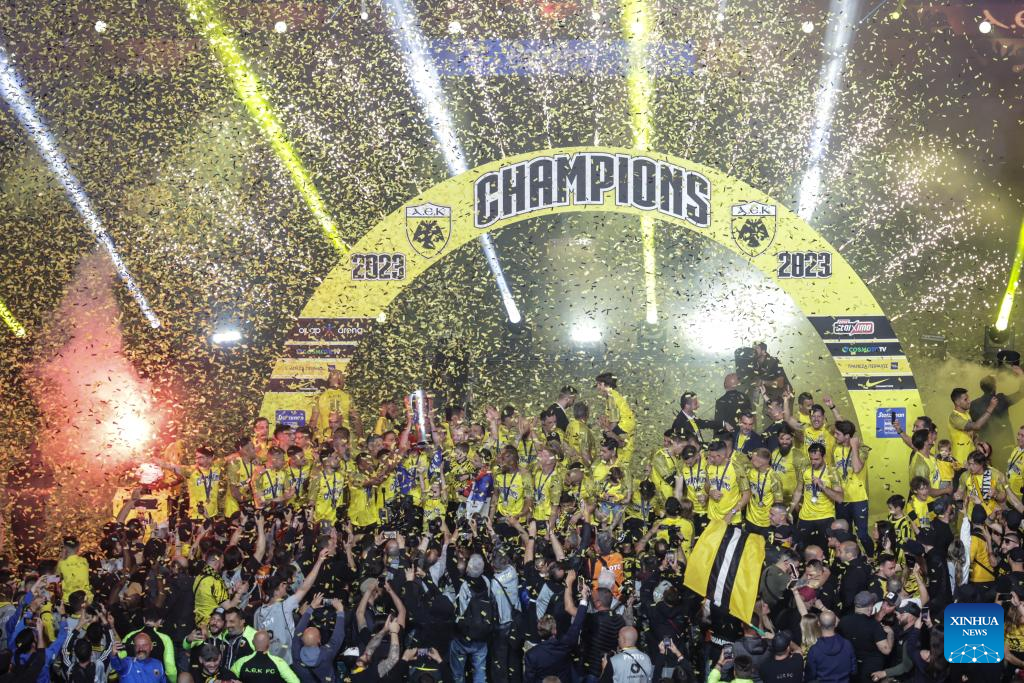 Players of AEK celebrate for winning the championship after the Greece Super League playoff match between AEK FC and FC Volos in Athens, Greece, May 14, 2023. (Photo by Lefteris Partsalis/Xinhua)