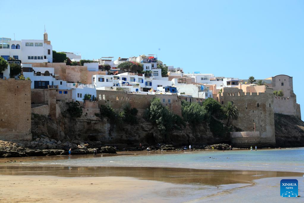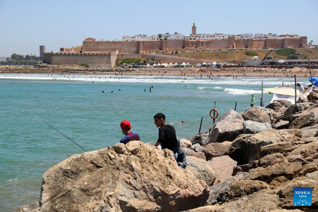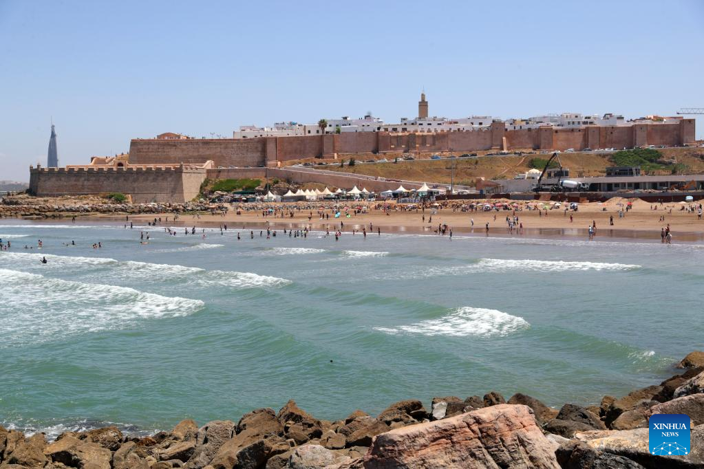 People enjoy their leisure time on a beach near the Kasbah of the Udayas in Rabat, Morocco, May 13, 2023. (Xinhua/Sui Xiankai)