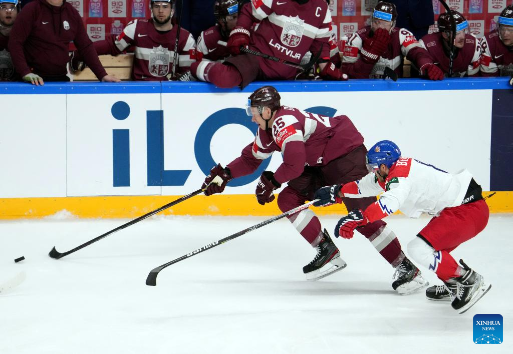 Latvia's forward Oskars Batna (L) vies with the Czezh Republic's forward Jiri Smejkal during the Group B match between Latvia and the Czech Republic at the 2023 IIHF Ice Hockey World Championship in Riga, Latvia, May 15, 2023. (Photo by Edijs Palens/Xinhua)