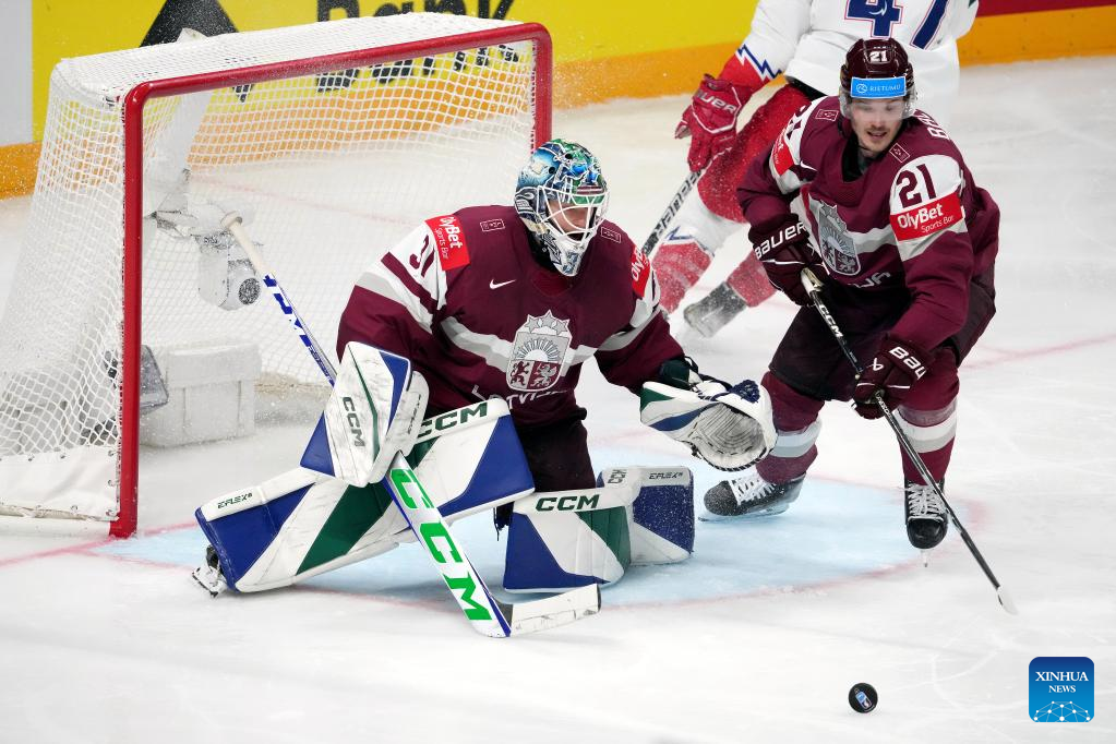 Latvia's goalkeeper Arturs Silovs (L) tries to make a save during the Group B match between Latvia and the Czech Republic at the 2023 IIHF Ice Hockey World Championship in Riga, Latvia, May 15, 2023. (Photo by Edijs Palens/Xinhua)